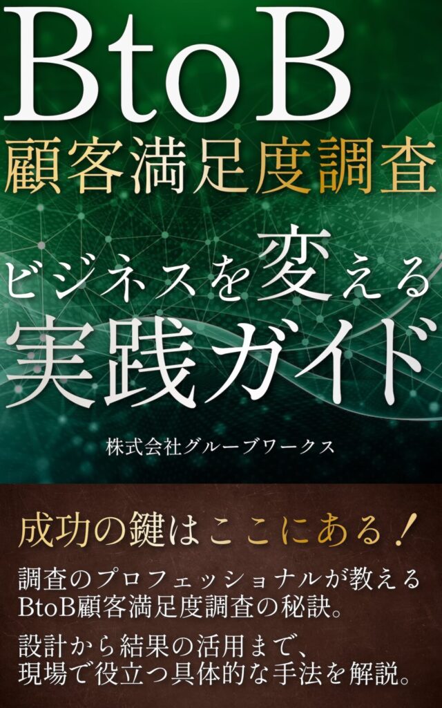 顧客満足度調査を体系的に理解したいというBtoB企業の皆様向けに、当社で蓄積してきたノウハウを体系化し、企画 → 設計 → 実査 → 分析 → 改善 までを一冊にまとめたのが、『BtoB顧客満足度調査 ビジネスを変える実践ガイド』です。