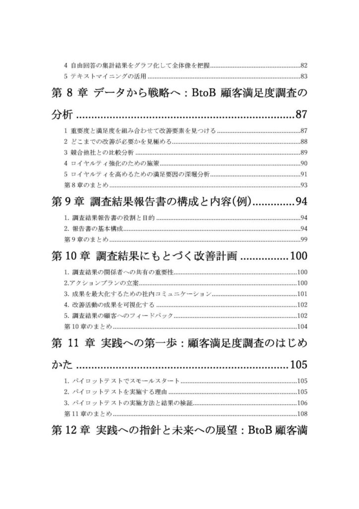 調査を実施しても改善が進まない──多くの企業が経験するこの問題に対し、第10章では改善活動の設計・社内浸透・成果の見える化までを整理しており、調査が組織を動かすための実践的アプローチが学べます。